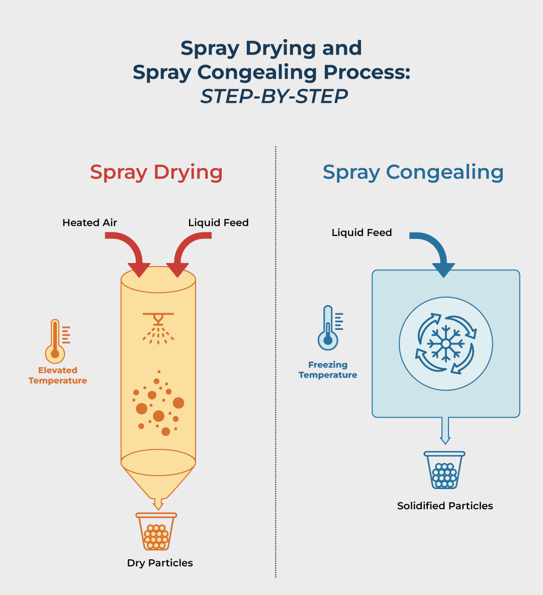 Spray congealing is a process in which a molten material is atomized and solidified into particulate form through cooling. Unlike traditional spray drying, which removes moisture or solvent to form a solid crust, spray congealing involves the phase change of a melt into a solid state without evaporation.